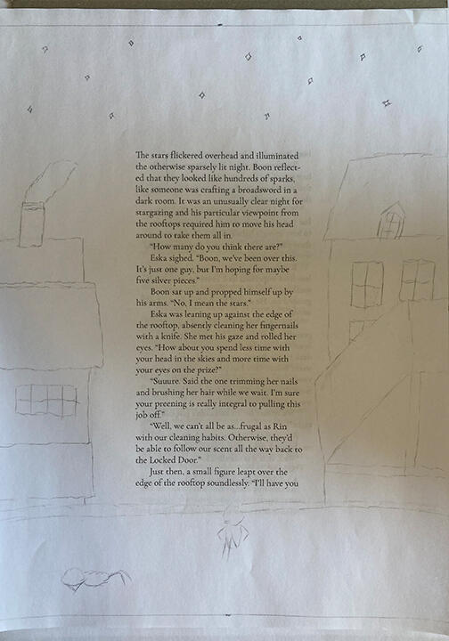 Being a fourth-year student with a job during the COVID-19 pandemic made for numerous challenges in regard to my time. The biggest challenge was actually writing the story itself. I vastly underestimated the amount of time it would take to write 5,600 words in the form of a story that had themes, began a journey but also was self-contained enough to be a narrative on its own. Another problem I had not foreseen was the intentions behind keeping the art in the margins and having the text as separate. While there would have been ways to keep the same structure in each page while still melding the art and text, it made more sense to find a more creative combination of both. This required further research and a do-over of my storyboards. Otherwise, the process of learning InDesign, how to draw and creating QR codes just came down to sitting down and trying until I got it. That took some time, but I had expected that and those processes went as smoothly as I could have hoped for.